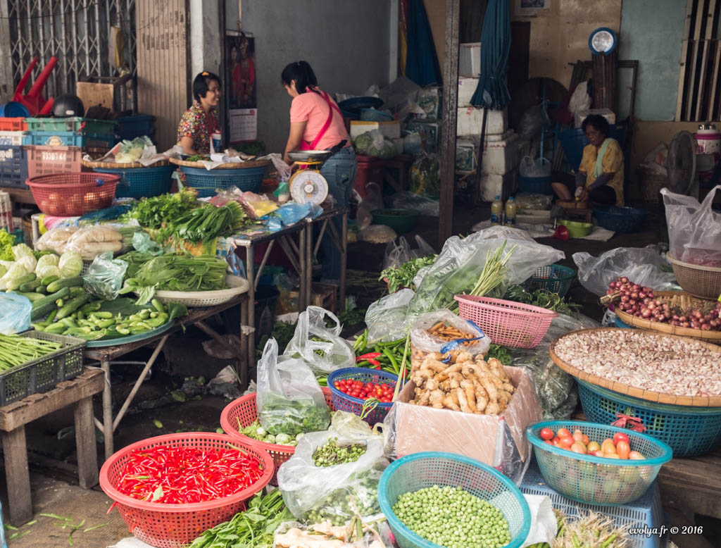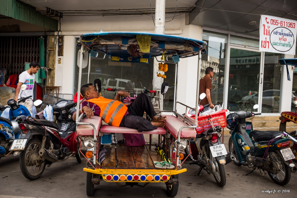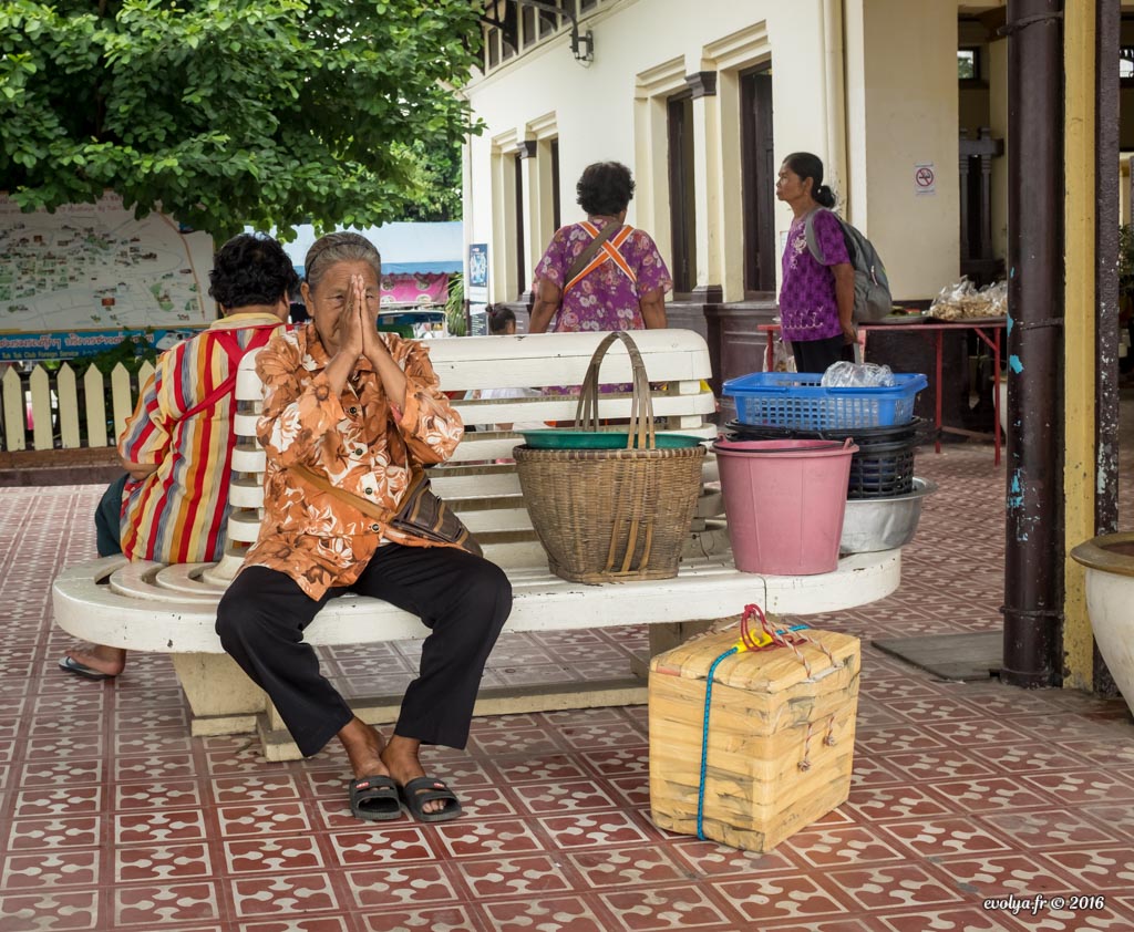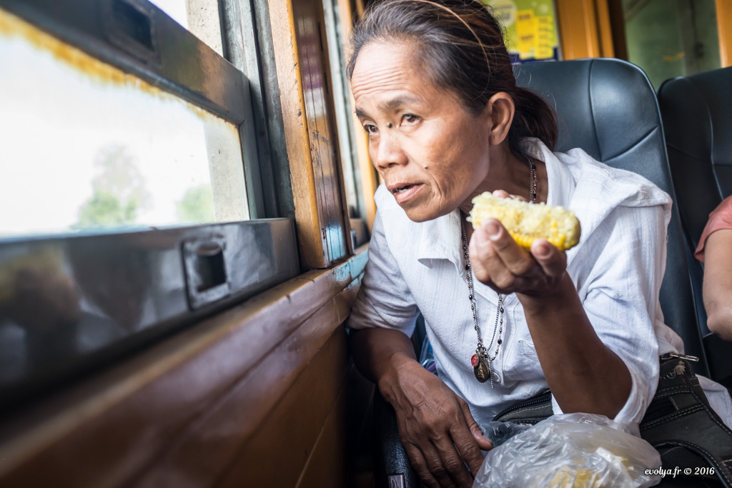 Pour notre départ de Lopburi, nous tenions absolument à prendre le train. Enfin surtout moi ! Avec quelques baths, nous avons fait presque 5 heures de train, mais en troisième classe. L'inconfort laisse vite sa place à l'émerveillement quand on voit défiler par dizaine les vendeurs ambulants qui proposent des mets divers et variés aux (trop) nombreux passagers. On laisse défiler tranquillement le paysage lors de ce voyage, admirant les rizières et la végétation qui se complait dans ces plaines immergées...