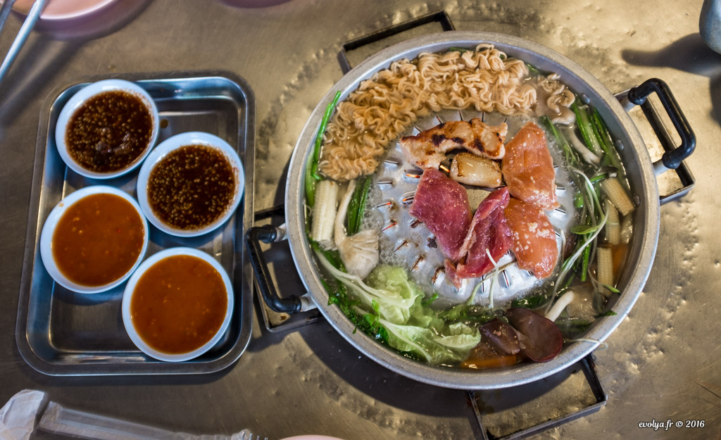 Il s'agit d'une sorte de barbecue qui se pose au milieu de la table, et qui permet à la fois de faire griller des viandes et de faire cuire des légumes dans du bouillon. C'est un bon moyen de manger bien et pas cher.